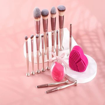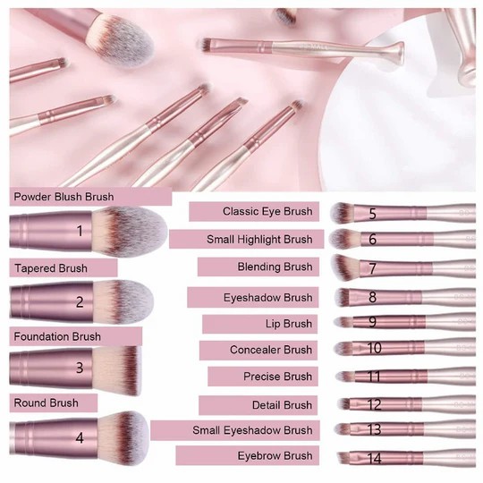 化妆刷 14 件套,配有化妆海绵和清洁剂,可以站在桌面上,您可以将其放在桌子上,而不必担心弄脏桌子或刷子。满足您所有化妆的所有需求。使用BS-MALL混合刷、眉刷、眼影刷等可以给你带来类似于专业化妆师化妆的效果!这包括一个特殊形状的化妆搅拌器。