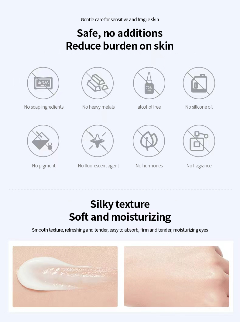 滋养呵护,焕发光彩】密集修护眼部肌肤,修复衰老迹象,轻盈乳霜质地,易于吸收,不油腻。适用于所有肤质,不添加酒精色素、矿物油,敏感肌肤也可使用。