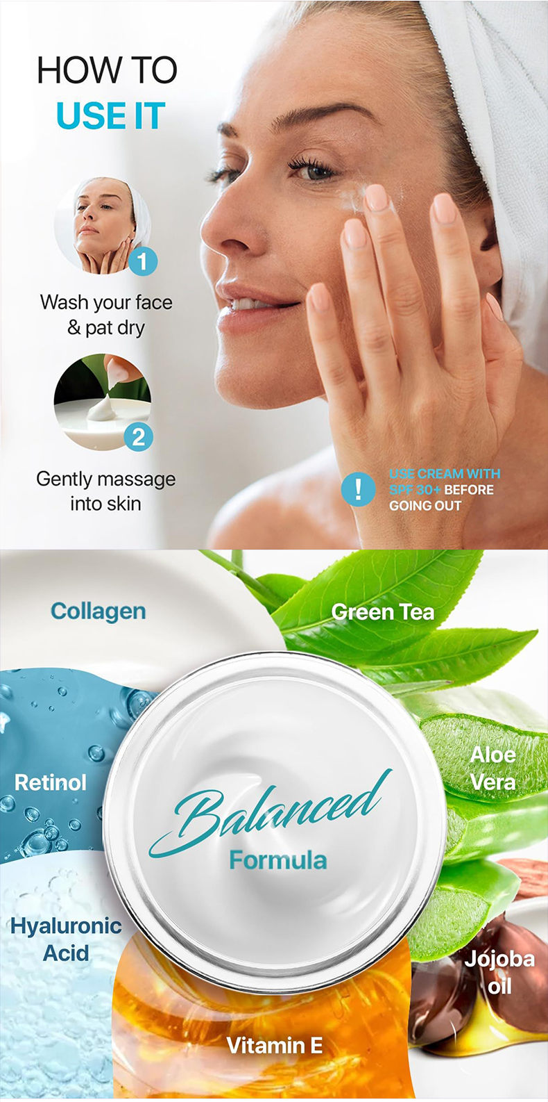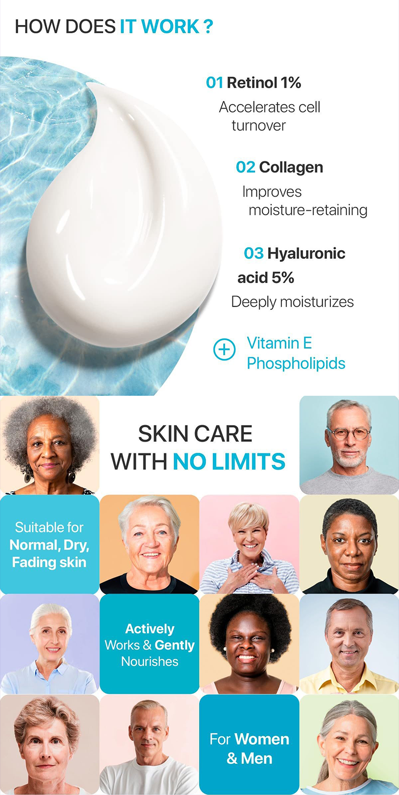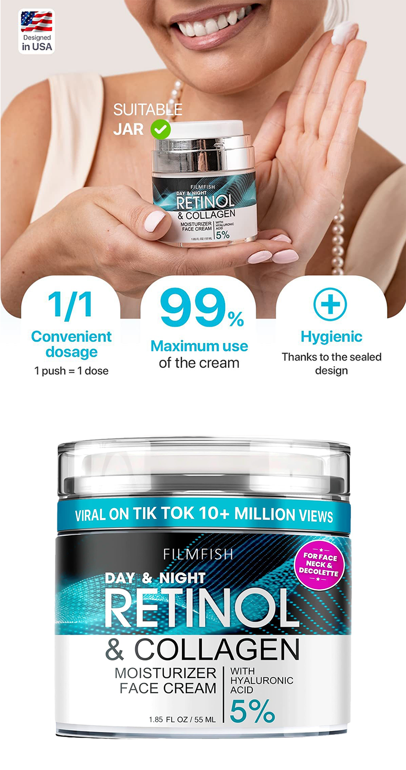 纯净成分: 我们在视黄醇保湿霜中添加了胶原蛋白和 5%透明质酸,以保持肌肤水润并增强其弹性。