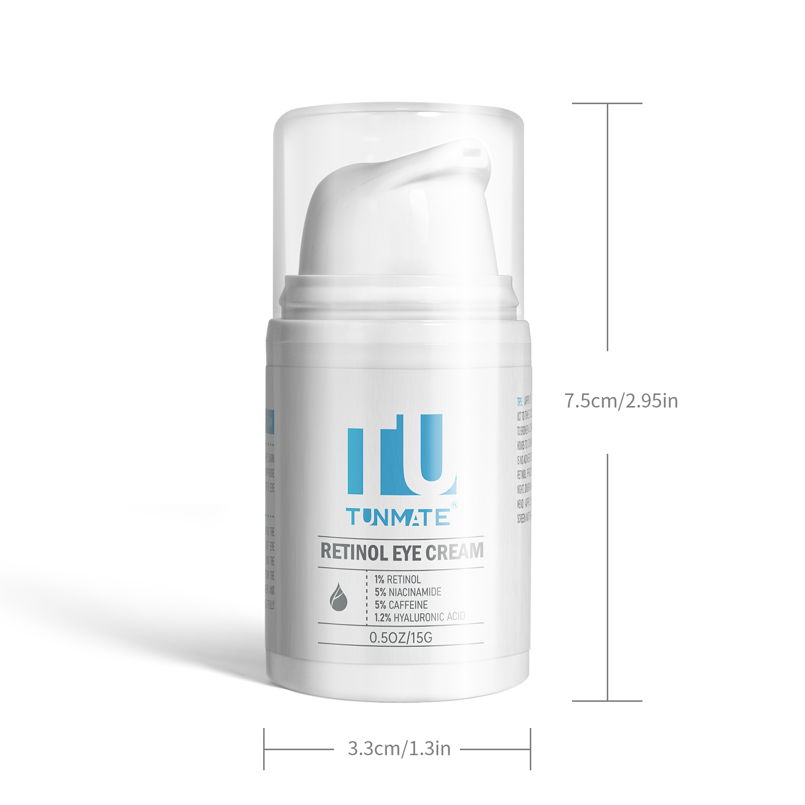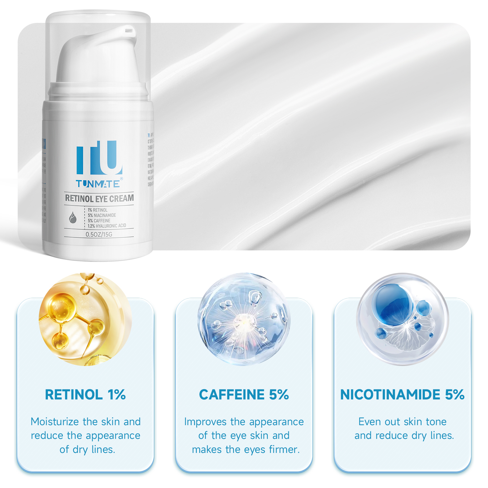 多添加功效型成分:视黄醇1%,咖啡因5%、烟酰胺5%、透明质酸1.2%