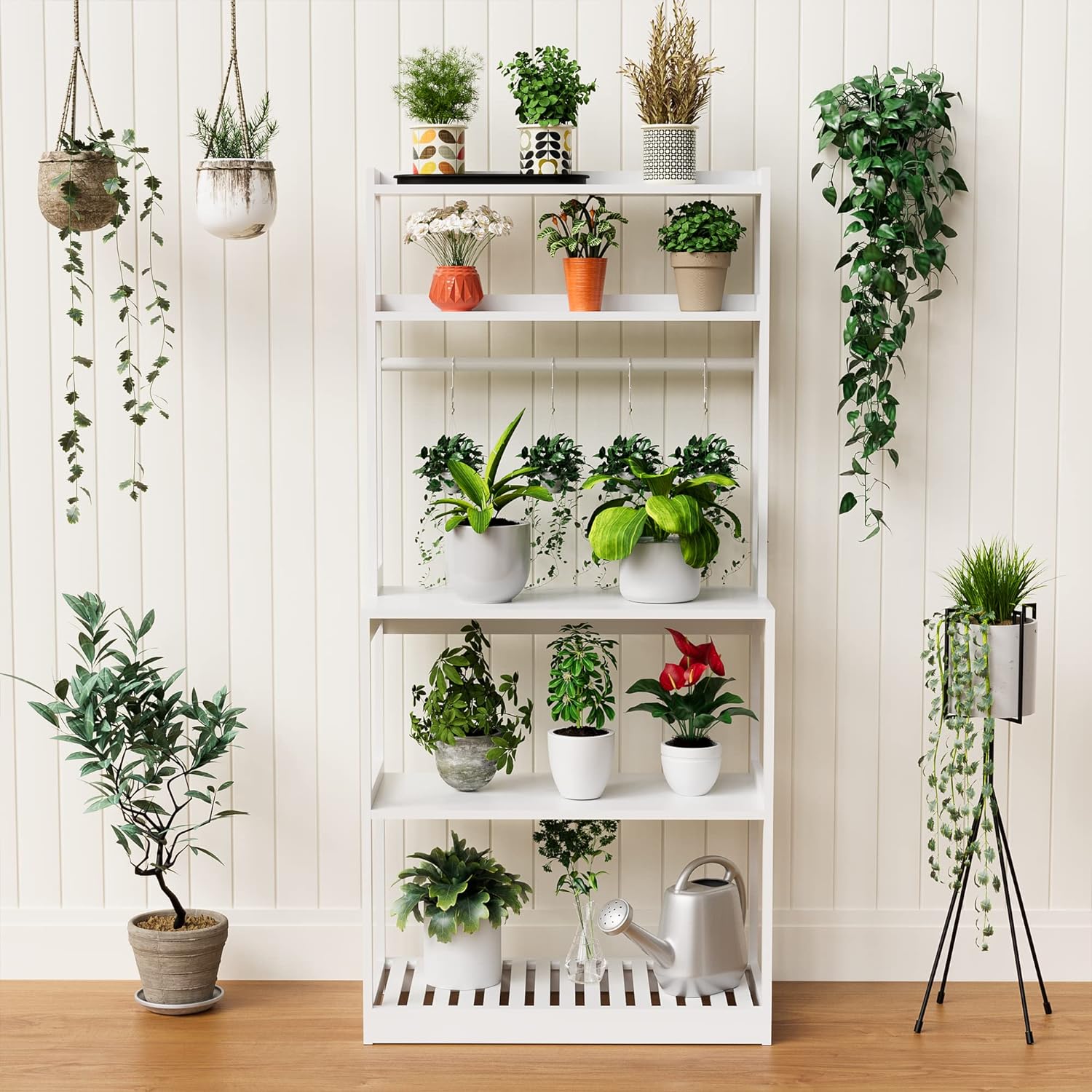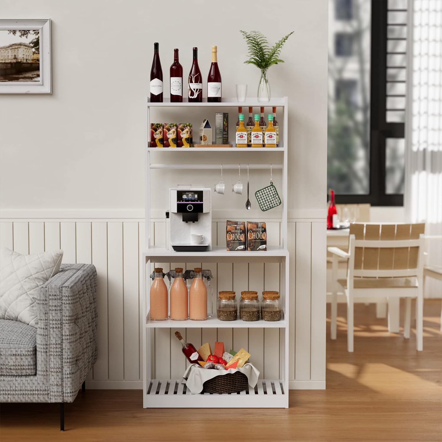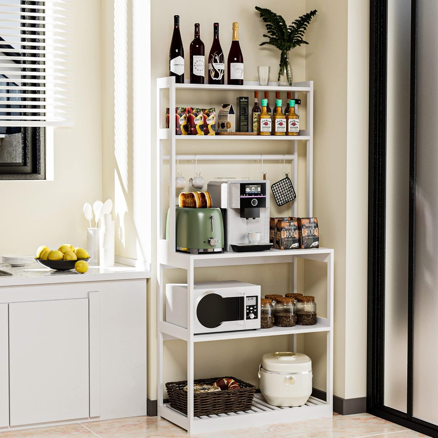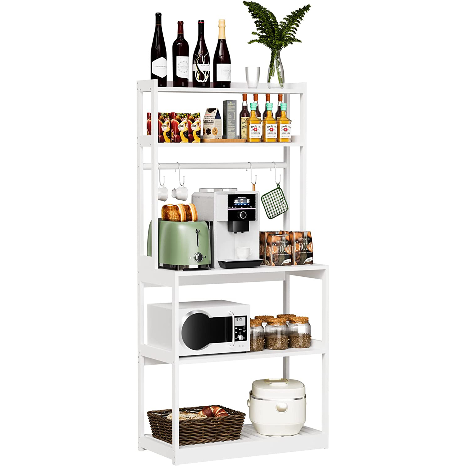 BZH Bamboo Microwave Rack, Kitchen Baking Rack with Storage Rack, 5-Tier Kitchen Rack with 4 Hooks, Heavy Duty Shelves for Kitchen, Living Room, Hallway, Balcony(Amazon banned)
