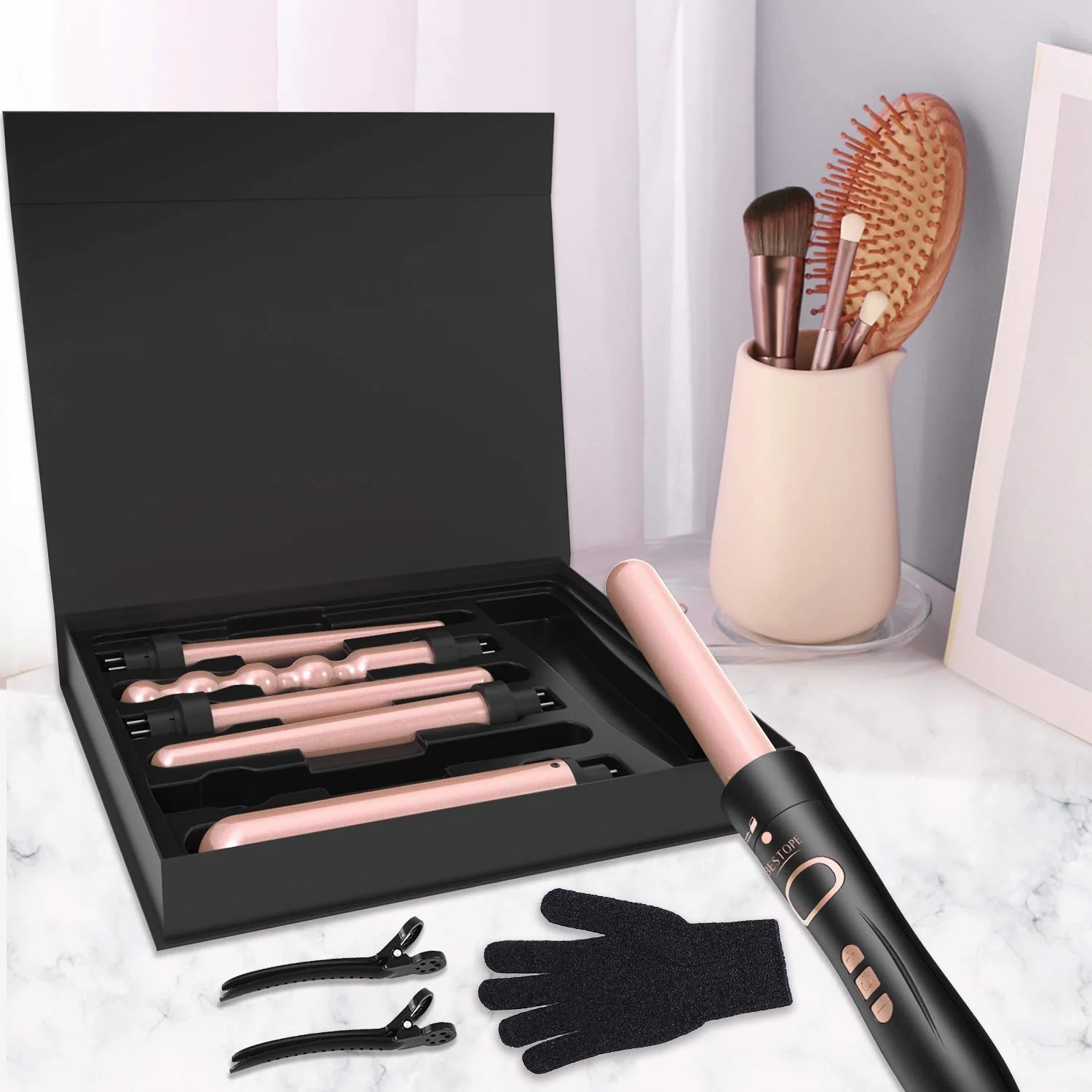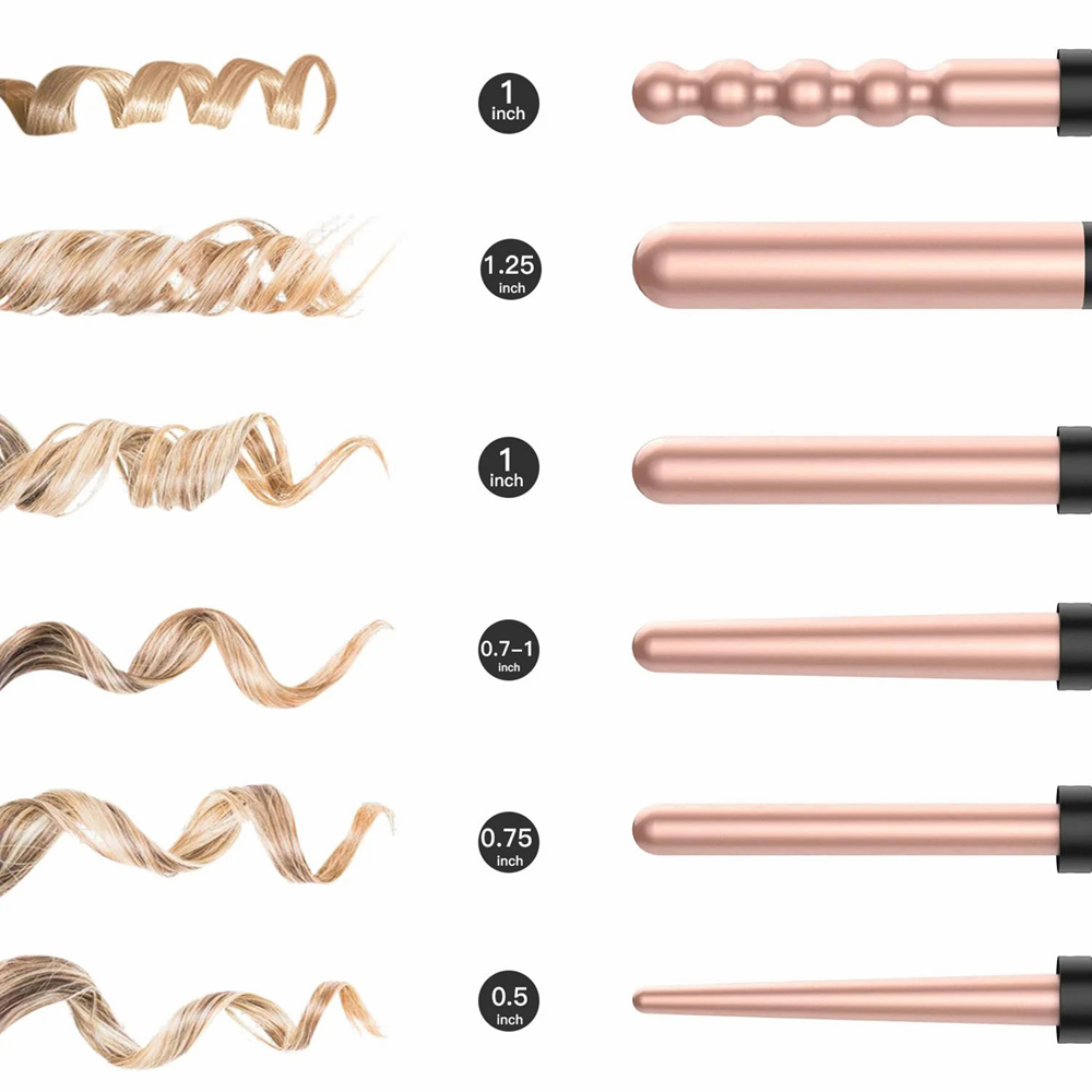 关于此商品 【6 个可互换卷筒 6 种发型】BESTOPE 专业陶瓷卷发器套装包括 6 种不同尺寸的电气石陶瓷卷筒,可让您以几种不同的方式设计您的头发:32 毫米用于松散的卷发,25 毫米用于自然卷发,19 毫米用于身体波浪,锥形 18-25 毫米用于小卷发或中卷发,珠状 25 毫米用于复古波浪。 【合格电气石陶瓷】采用专业陶瓷电气石,卷发棒可产生强效负离子,消除毛躁和静电,帮助打造光滑闪亮的发型。它还有助于在 30 秒内加热,帮助您在繁忙的早晨快速造型,为您节省大量时间。 【LCD 显示屏和温度控制】此卷发棒设定温度直接显示在 LED 显示屏上,方便您轻松检查所需温度。通过按 +/- 键可将温度从 140°F 调节到 430°F,适合所有类型的头发,因此与单加热按钮卷发器相比,它可以保护您的头发。 【双电压和绝缘保护】双电压设计(110-240V AC)可自动调节到合适的电压,方便旅行;手柄采用舒适的材料,额外的手套为您带来双重绝缘保护;360°旋转电源线让您更自由地调整卷发器,并从任何角度造型您的头发。 【随附配件和售后保修】卷发棒套装包含6个不同的卷发筒、1副防护手套和2个发夹。如果您遇到任何问题,请随时与我们联系,我们将为您提供最好的售后服务并解决问题。